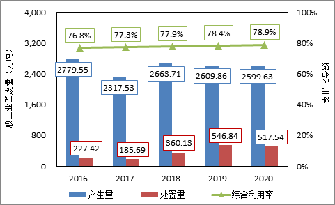 “十三五”期间,国家发改委和工信部批准淮南市作为全国50个大宗固废综合利用基地之一,标志着淮南大宗固废利用已被纳入全国战略发展布局。2016-2020年,全市一般工业固体废物年产生量均在两千万吨以上,占全省一般工业固体废物年产生量的1/5以上。全市一般工业固体废物产生量总体呈下降趋势,2020年全市一般工业固体废物产生量较2016年下降6.5%。全市一般工业固体废物综合利用率总体呈上升趋势,2020年全市一般工业固体废物综合利用率较2016年提升2.1%。2020年,全市一般工业固体废物产生量为2599.63万吨,其中综合利用量为2052.24万吨,综合利用率为78.9%,处置量为517.54万吨,处置率为19.68%。