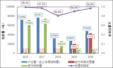 “十三五”期间,淮南市工业危险废物产生量(含上年度结转量)呈波动变化趋势,2020年全市工业危险废物产生量较2016年下降33.5%。全市工业危险废物综合利用率呈先下降后上升变化趋势,处置利用率平均值达92.9%。全市工业危险废物委外转移量总体呈下降趋势,自行处置利用量总体呈上升趋势。2020年,全市工业危险废物产生量47826.15吨,委外转移量3537.09吨,自行利用处置量42768.18吨,处置利用率达96.8%。
