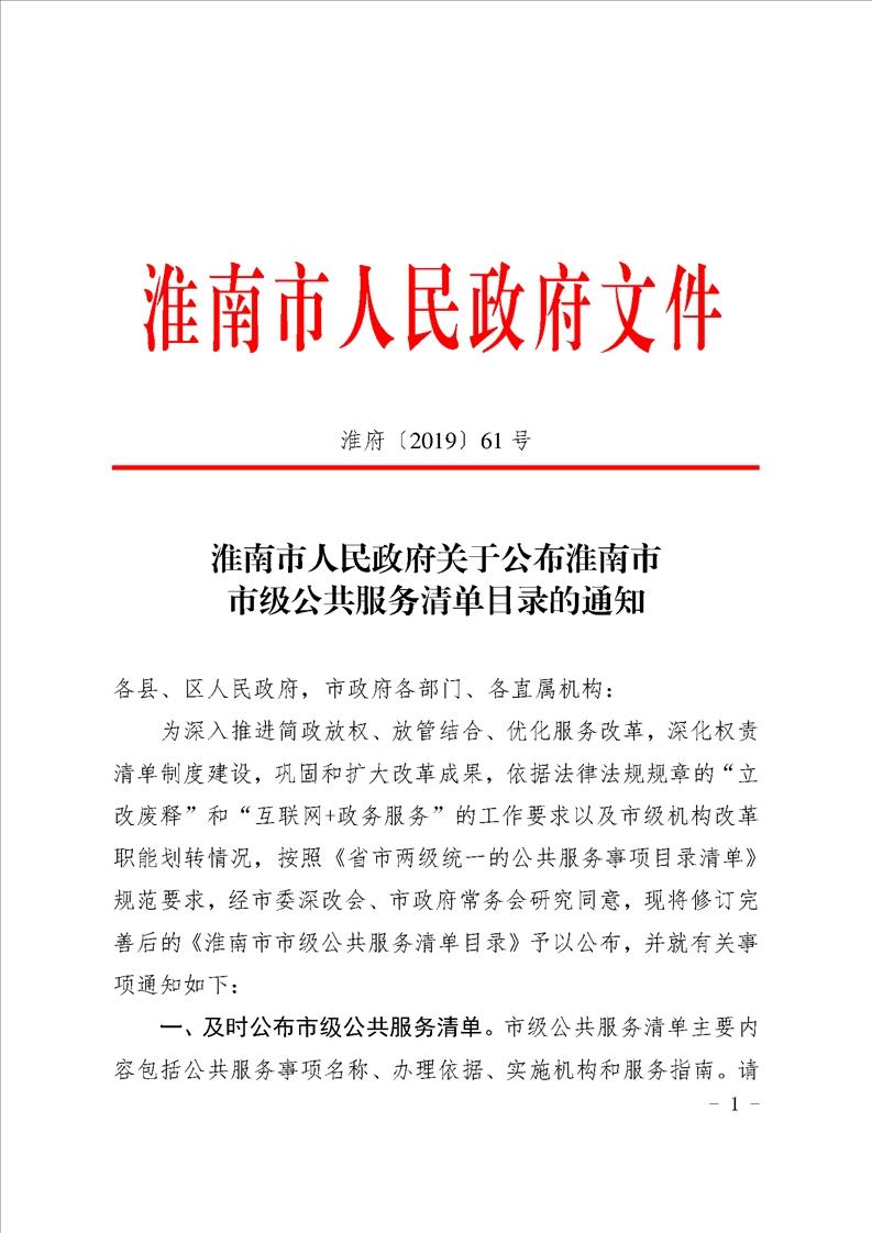 淮南市人民政府关于公布淮南市市级公共服务清单目录的通知_淮府〔2020〕61号